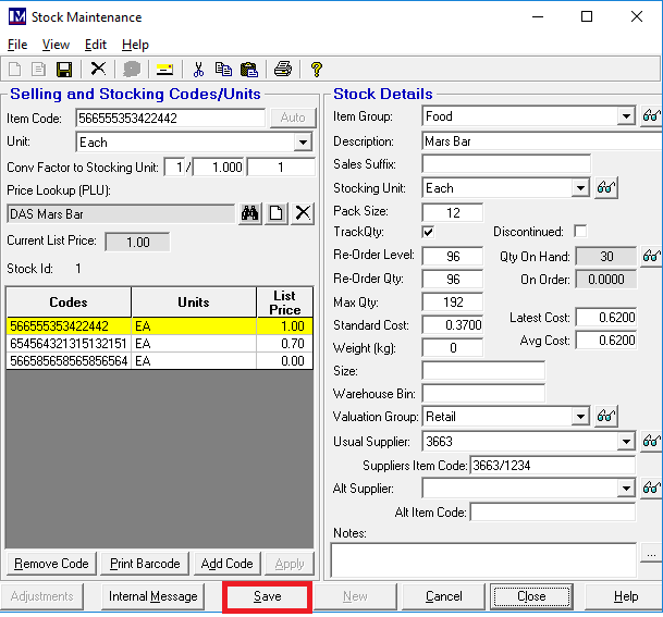 N.B. please remember to click ‘Save’ after amending any stock item data in this screen.
