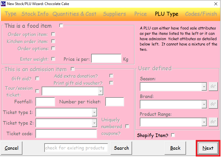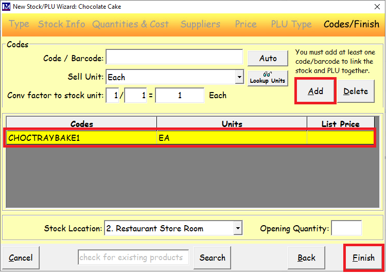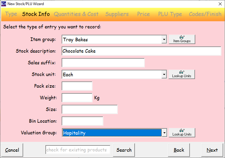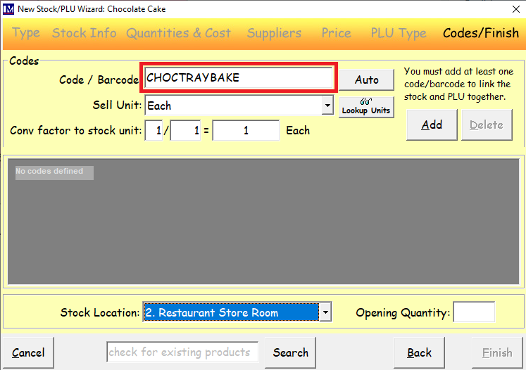 At the following screen enter a ‘Code’ for this “finished product” stock item (e.g. CHOCTRAYBAKE).