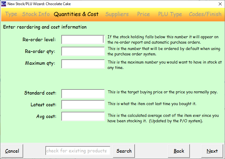 As stock items in question are usually batch cooked in-house, these are not usually ordered from a specific supplier. This means that the ‘Re-order level:’, ‘Re-order qty:’ and ‘Maximum qty:’ would not normally be required in this scenario. If so, these fields can be left blank or enter the information as required by typing the required number. Please see the descriptions to the right of each of the above fields for information as to what each of the fields is used for. These fields relate specifically relating to automatic 'Purchase Order' generation functionality (and related reports) that is covered in a separate guide.