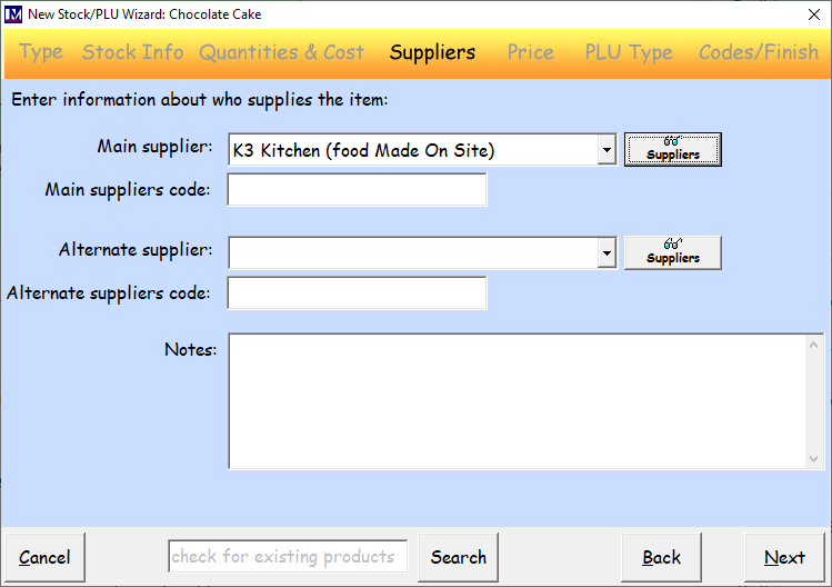 'Main Supplier’ is not mandatory as this item is not supplied it is cooked in house, but you may want to create an internal supplier(s) for such 'Recipe' stock items, e.g. "Catering Department" and select this. This will be helpful in the future for filtering data when searching for products and will also be useful for running reports that have a ‘Supplier’ selection in the report parameters (filters). So, it is recommended that you create an internal supplier(s). Please note that can be done by clicking the 'Suppliers' button and creating a 'Supplier' in the usual way then selecting it, however if deemed as not required then this can be left blank as it is not mandatory for the reason given above.