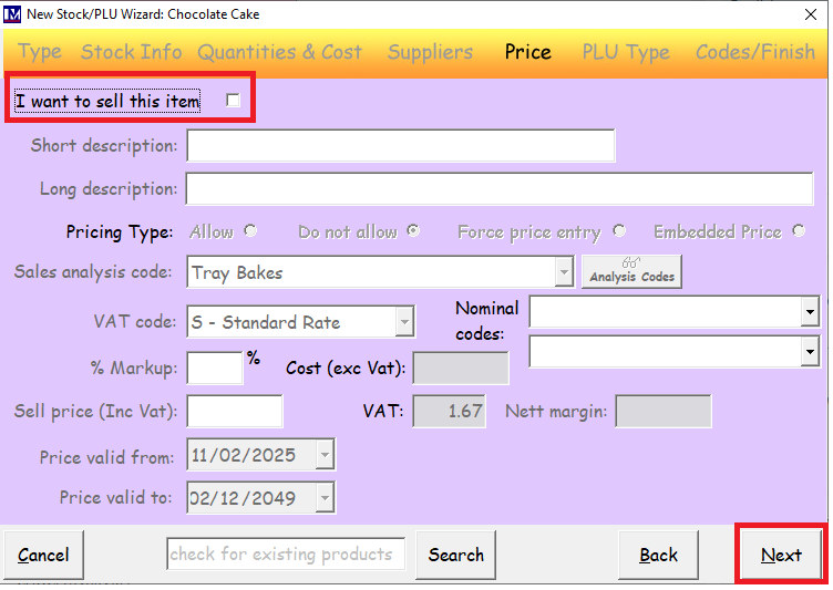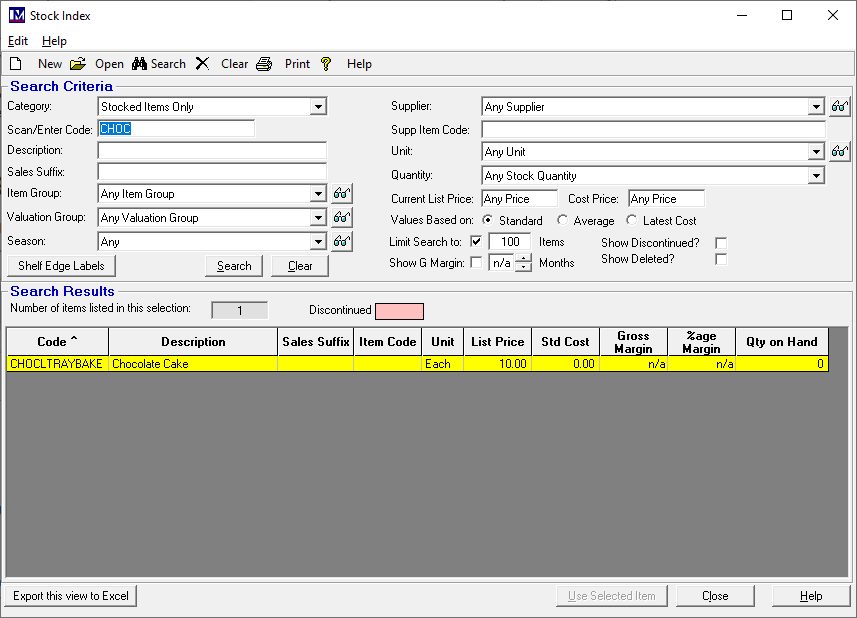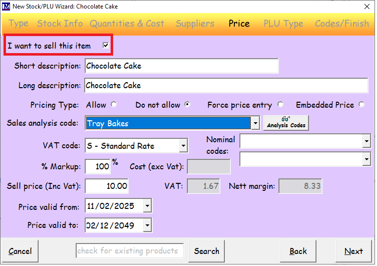 - Enter the required ‘Stock Description’ (e.g. ‘Chocolate Cake’)