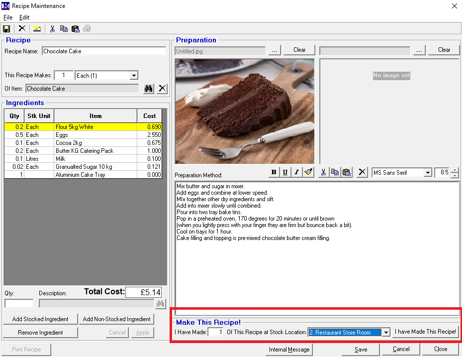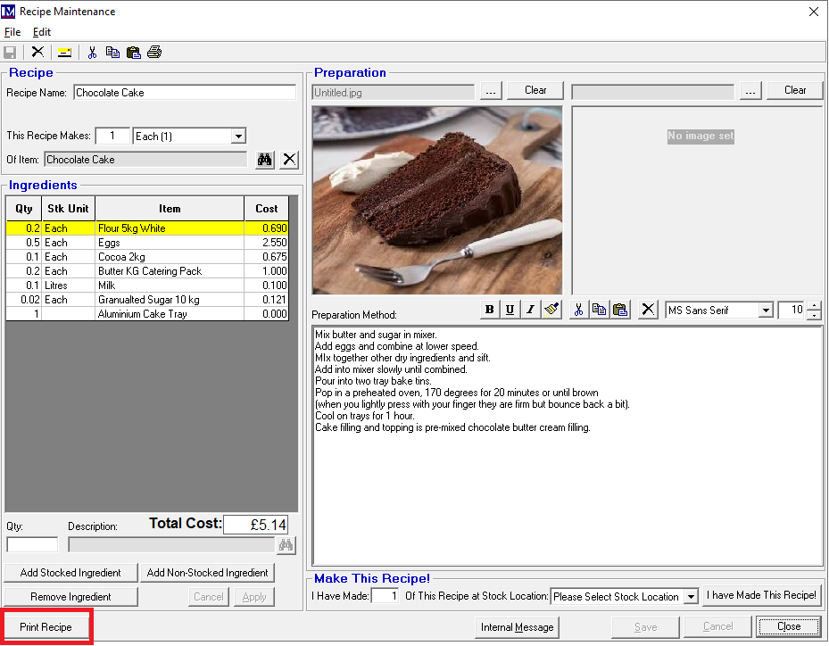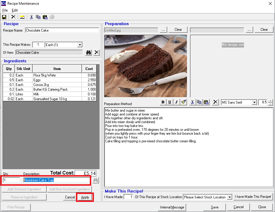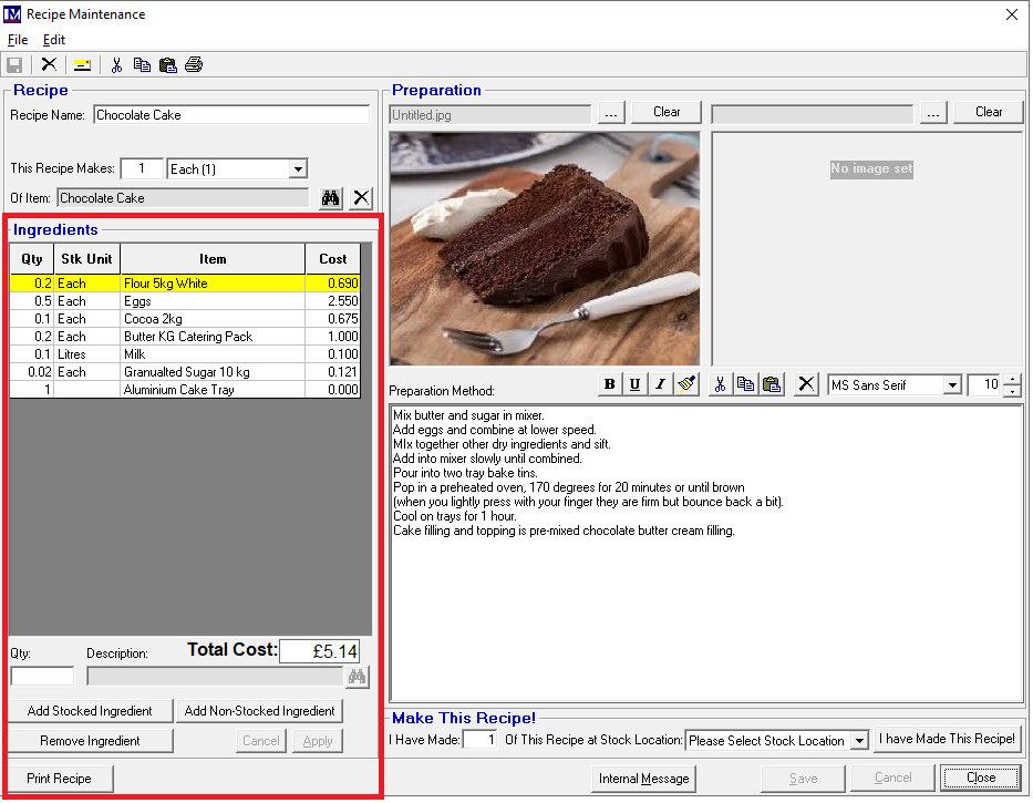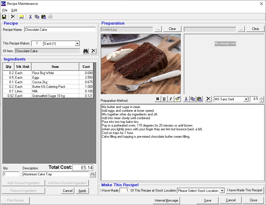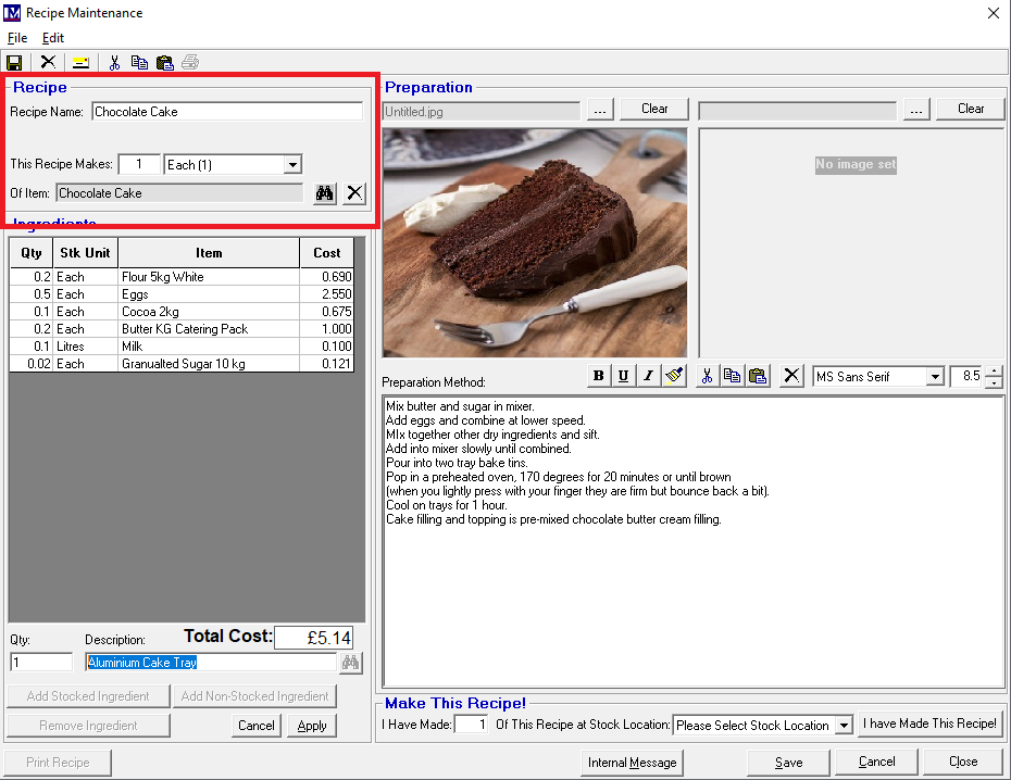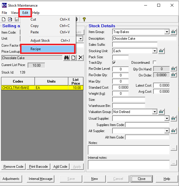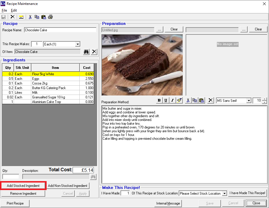 You must also create a stock item that will be the end product (e.g. a ‘Chocolate Cake’ stock item). This part was covered earlier and so we need to be in 'Recipe Maintenance' screen (below) of the stock item product you created.