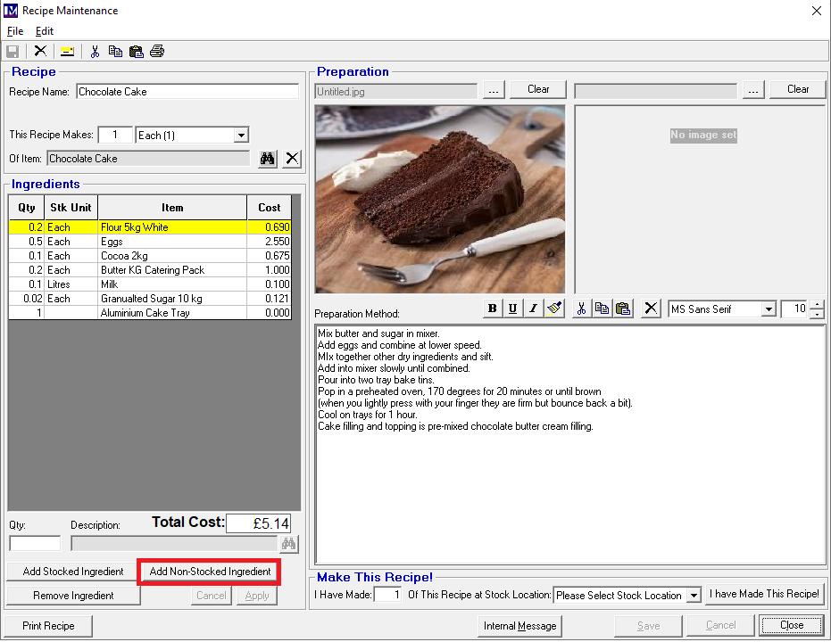 Non stocked ingredients option really just allows you to enter a quantity and a text description line into a recipe for ingredients that are not in the ‘Merac’ software. These are really to add information into the recipe that are for reference only, but are not 'stock items' in Merac.