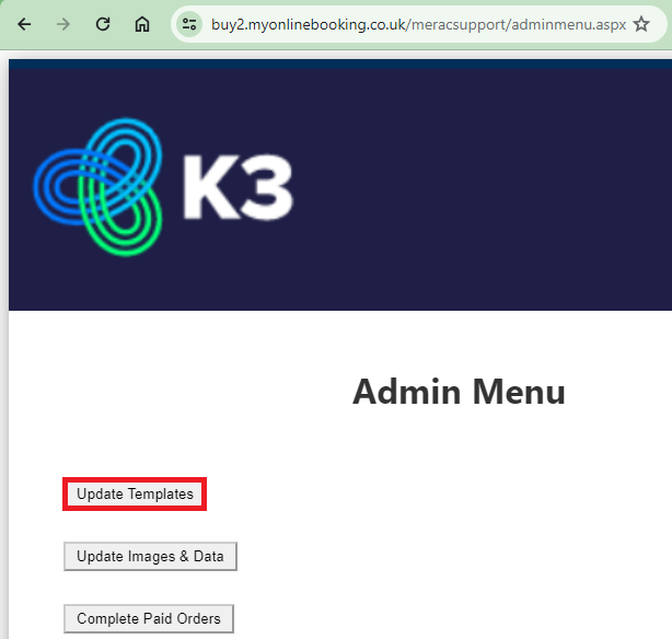 4. Once you have gained access to your website Back Office portal, you then need to click Update Templates. This will then prompt once this process is complete, which typically takes a couple of seconds.